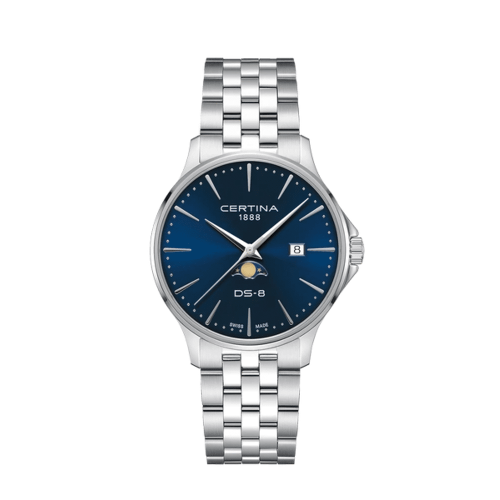 Certina DS 8 Moonphase 38Mm, Bracelet Acier Argenté, Cadran Bleu, 10Atm C0454231104100