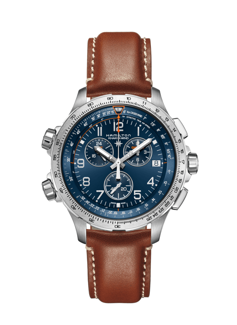 La Hamilton Khaki Aviation X-Wind GMT Chrono Quartz est à la fois innovante, aventureuse et exceptionnellement précise. Privilégié pour assurer le chronométrage du premier service postal aérien américain en 1918, Hamilton est un pionnier dans le domaine des montres pour pilotes. Cette montre de pilote professionnel avec chronographe est équipée d'un mouvement à quartz de haute précision ETA G10.962 et de chronomètres jusqu'à 12 heures. Le boîtier magnifiquement poli et le couvercle vissé sont bien sûr fabriqués en acier inoxydable de la plus haute qualité. La face avant du boîtier est parfaitement finie avec un verre saphir résistant aux rayures. Les 3 couronnes vissées assurent une parfaite résistance à l'eau. Les aiguilles, les index et les chiffres arabes lumineux sont montés sur un cadran bleu avec une indication de la date à la position 3 heures. De plus, cette montre exceptionnelle possède 2 bagues intérieures tournantes et une bague extérieure tournante. Il calcule la vitesse et la direction du vent ainsi que l'angle de déviation causé par les vents latéraux. Le bracelet en cuir brun épais est fabriqué en cuir de veau de la meilleure qualité et comporte une boucle de fermeture. Cette aventureuse montre pilote chronographe pour homme de fabrication suisse, avec une étanchéité à 10 bars (natation), est livrée dans l'emballage d'origine Hamilton et bénéficie d'une garantie internationale de 2 ans.
