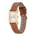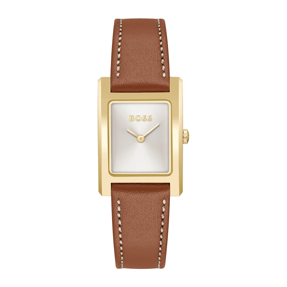 La montre Hugo Boss Lucy est équipée d'un cadran blanc et d'un bracelet cuir brun.