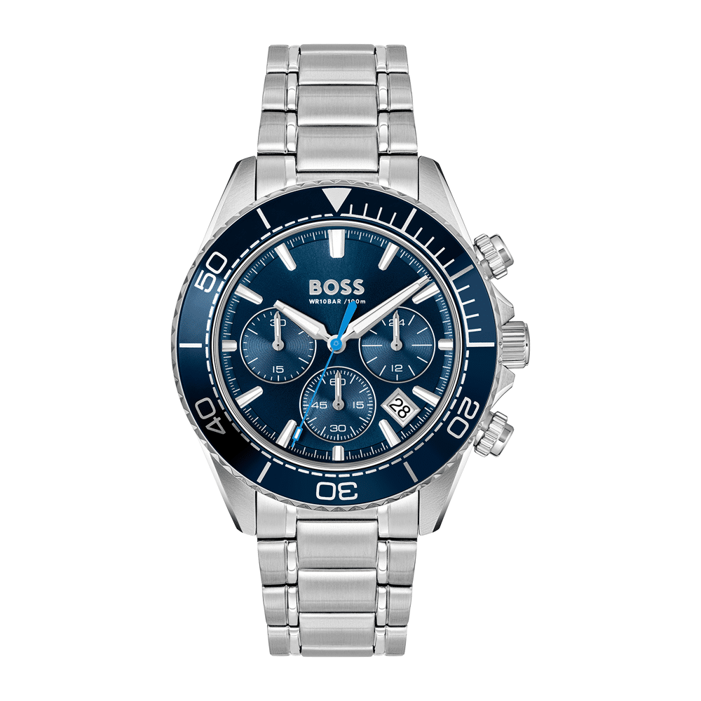- **NOT FOUND** key: product.notifyMeModalProduct Boss Black Chrono Horloge, Zilverkleurige Stalen Band, Blauwe Wijzerplaat, Stalen Kast, Datum, 44Mm, 10 Atm, 1514322