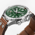 Het horloge onderscheidt zich door een opvallende groene wijzerplaat met contrasterende Arabische cijfers, wat zorgt voor een optimale leesbaarheid. De robuuste constructie van de roestvrijstalen kast (dikte van ongeveer 12,8 mm) wordt gecompleteerd door saffierglas voor superieure bescherming.