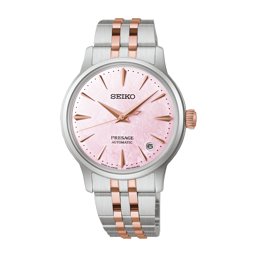 De Seiko Presage SRPM06J1 is een gelimiteerde editie van 9.000 stuks, voortgekomen uit de exclusieve samenwerking met Hisashi Kishi, hoofdbutler van de STAR BAR in Ginza en meester-ambachtsman. Dit horloge is geinspireerd op zijn originele creatie, de Sakura Aviation cocktail, die de zachte sfeer van kersenbloesems in de lente oproept.
