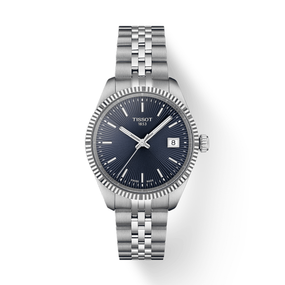 De Tissot Ballade T156.210.11.041.00 is een horloge met een tijdloze elegantie, ontworpen voor wie op zoek is naar een discreet maar verfijnd accessoire. Dit 34 mm model valt op door de diepblauwe wijzerplaat met een centraal guilloche-patroon, wat zorgt voor een prachtig samenspel van texturen en lichtinval. De gekartelde lunette, kenmerkend voor de Ballade-collectie, geeft de roestvrijstalen kast een klassieke en gedistingeerde uitstraling.