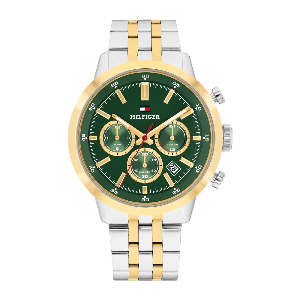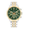 Tommy Hilfiger Dual Time Horloge, Tweekleurige Stalen Band, Groene Wijzerplaat, Stalen Kast, Datum, 43Mm, 5 Atm, 1710754